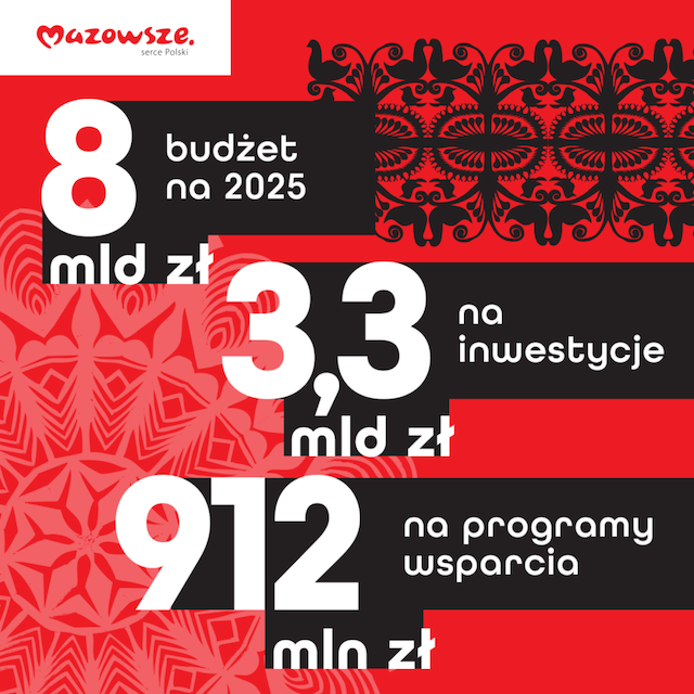 Budżet województwa mazowieckiego na 2025 rok wyniesie ponad 8 mld zł. Dzięki tym środkom samorząd zrealizuje na Mazowszu szereg inwestycji, rozwinie infrastrukturę, a przede wszystkim dofinansuje wiele projektów z programów wsparcia dla mieszkańców regionu.