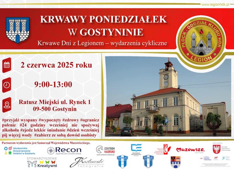2 czerwca krew będzie można oddać w godz. 09:00-13:00 przed ratuszem miejskim w Gostyninie.