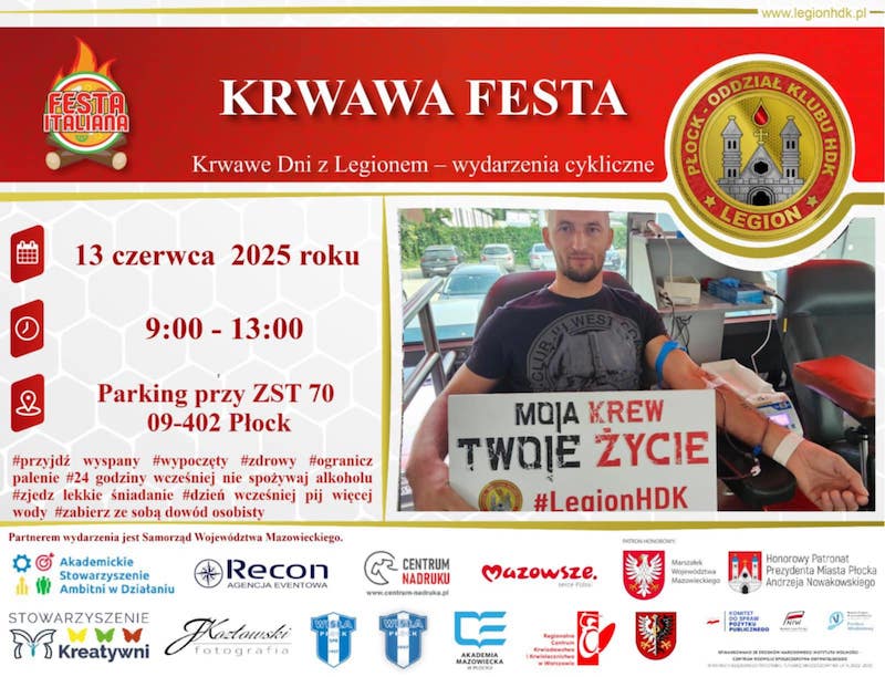 13 czerwca krew będzie można oddać w godz. 09:00-13:00 na parkingu przy Zespole Szkół Technicznych nr 70 w Płocku.