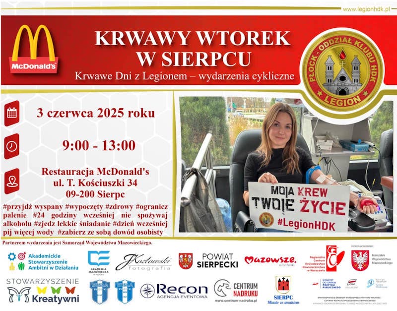 3 czerwca krew będzie można oddać w godz. 09:00-13:00 przed Restauracją McDonald’s przy ul. Tadeusza Kościuszki 34 w Sierpcu.