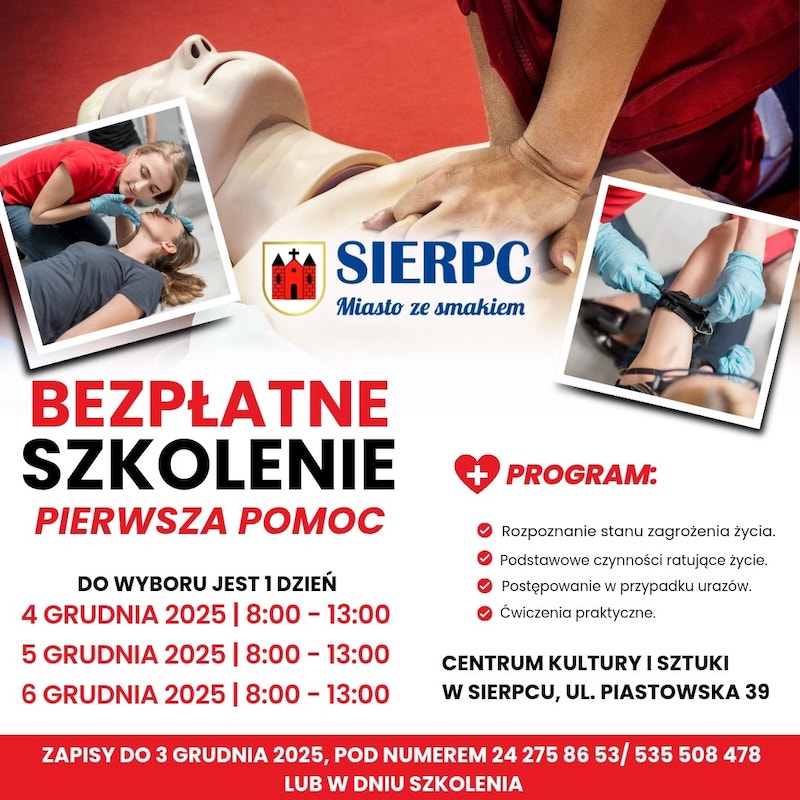 Szkolenia odbędą się w trzech terminach: 4, 5 oraz 6 grudnia 2025 roku, każdego dnia w godzinach 08:00–13:00. Uczestnicy dowiedzą się, jak rozpoznawać stan zagrożenia życia i jak prawidłowo reagować w pierwszych, kluczowych minutach.