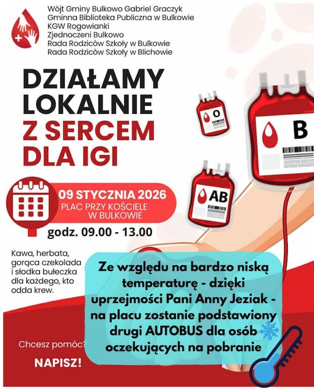 W piątek, 9 stycznia, w godz. 09:00-13:00 na placu przy kościele w miejscowości Bulkowo odbędzie się zbiórka krwi dla chorej Igi.