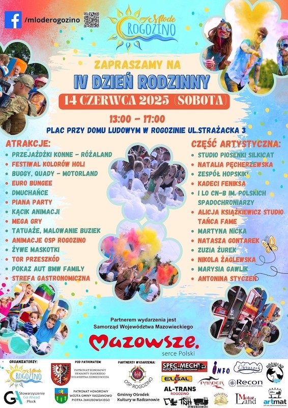 Młode Rogozino oraz Stowarzyszenie Go Ahead we współpracy z Samorządem Województwa Mazowieckiego, OSP Rogozino i Gminnym Ośrodkiem Kultury w Radzanowie zapraszają 14 czerwca na IV Dzień Rodzinny w Rogozinie. Zaplanowano m.in. przejażdżki konne, euro bungee czy tor przeszkód.
