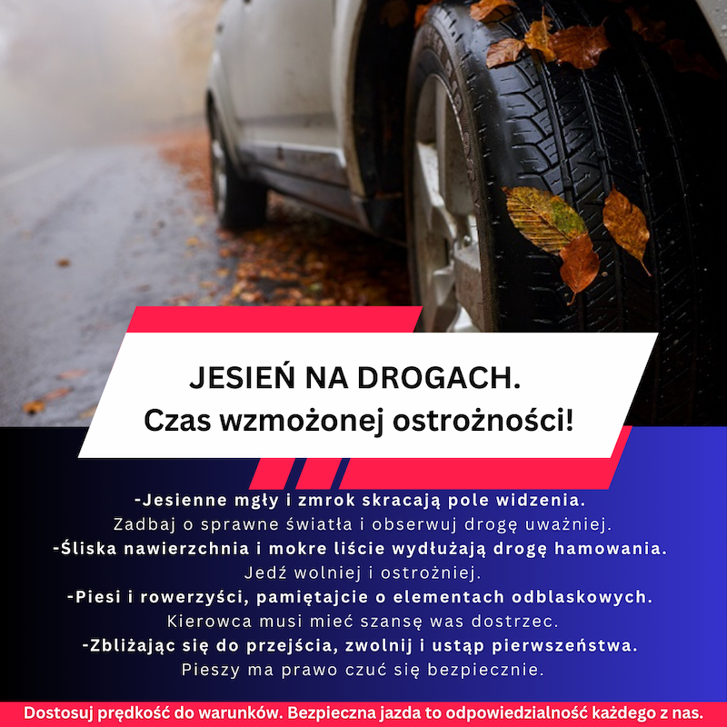 Policjanci przypominają, że jesień to szereg wyzwań dla uczestników ruchu drogowego. Zmienna pogoda, szybko zapadający zmrok, opady deszczu, mgły oraz poranne przymrozki sprawiają, że warunki na drogach stają się nieprzewidywalne i wymagają szczególnej uwagi zarówno od kierowców, jak i pieszych.