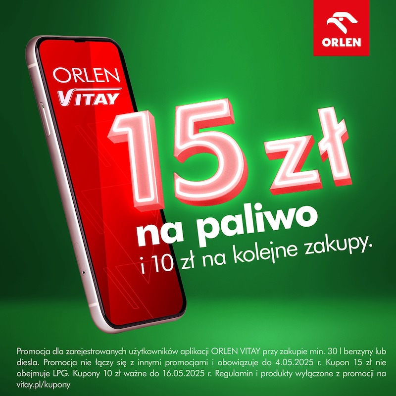 Jednorazowy kupon mobilny, aktywowany w aplikacji VITAY, umożliwi naliczenie 15 zł rabatu w przypadku zatankowania minimum 30 litrów benzyny lub oleju napędowego. Niezależnie, klient, który zatankuje 30 litrów benzyny lub oleju napędowego, na wydrukowanym paragonie dodatkowo znajdzie kupon paragonowy o wartości 10 zł, który można będzie wykorzystać na kolejne zakupy z oferty paliwowej lub pozapaliwowej ORLEN za minimum 11 zł.