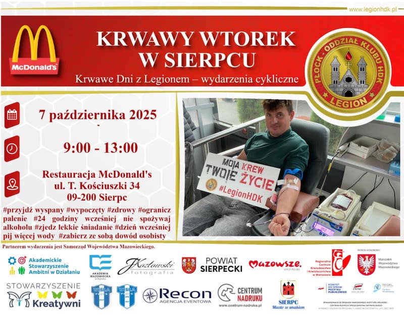 W najbliższy poniedziałek, 7 października, krew będzie można oddać w godz. 09:00-13:00 przy Restauracji McDonald’s przy ul. Tadeusza Kościuszki 34 w Sierpcu.