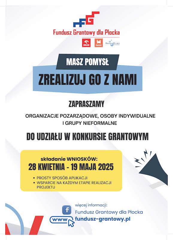 Fundacja „Fundusz Grantowy dla Płocka” ogłosiła nabór wniosków do kolejnej edycji konkursu grantowego. Celem konkursu jest wspieranie inicjatyw, które wpływają na poprawę jakości życia mieszkańców miasta.