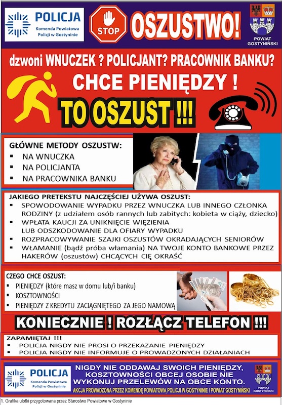 „Mechanizm działania sprawców jest zawsze podobny. Oszuści najczęściej telefonują późnym wieczorem, celowo wybierając porę, w której łatwiej wpłynąć na emocje i psychikę ofiary. Podszywają się pod członka rodziny, najczęściej wnuczka lub innego krewnego, przekazując informację, że rzekomo spowodowali wypadek drogowy. Fałszywy „wnuczek” tłumaczy, że aby uniknąć więzienia, konieczne jest natychmiastowe przekazanie pieniędzy” – przekazał mł. asp. Paweł Klimek, oficer prasowy gostynińskiej komendy.