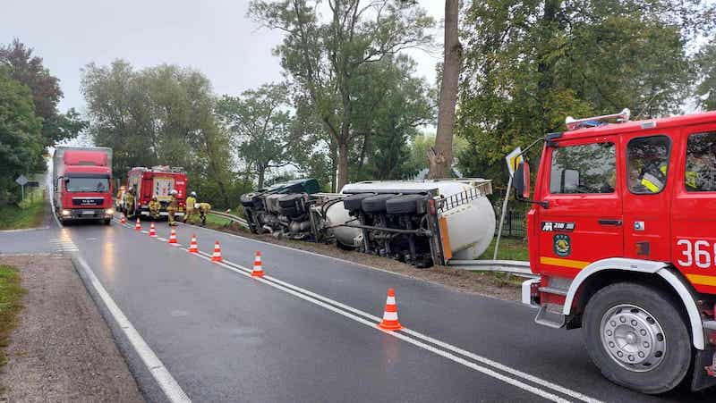 Jak informuje policja, 27-letni kierowca ciągnika siodłowego marki DAF z cysterną nie dostosował prędkości do warunków panujących na drodze, w wyniku czego zjechał z jezdni i wpadł do przydrożnego rowu.