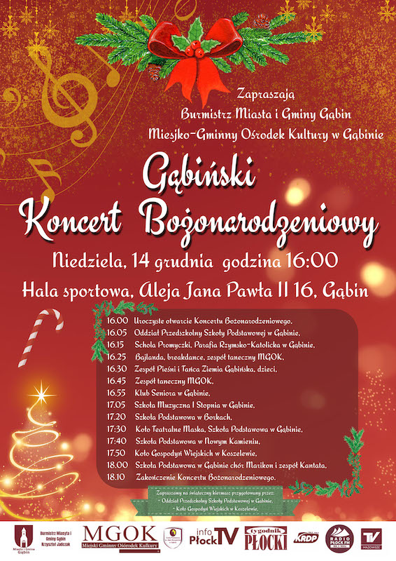 Burmistrz Miasta i Gminy Gąbin oraz Miejsko-Gminny Ośrodek Kultury w Gąbinie zapraszają mieszkańców 14 grudnia na Koncert Bożonarodzeniowy, podczas którego na scenie zaprezentują się lokalne zespoły, artyści i grupy działające na terenie gminy.