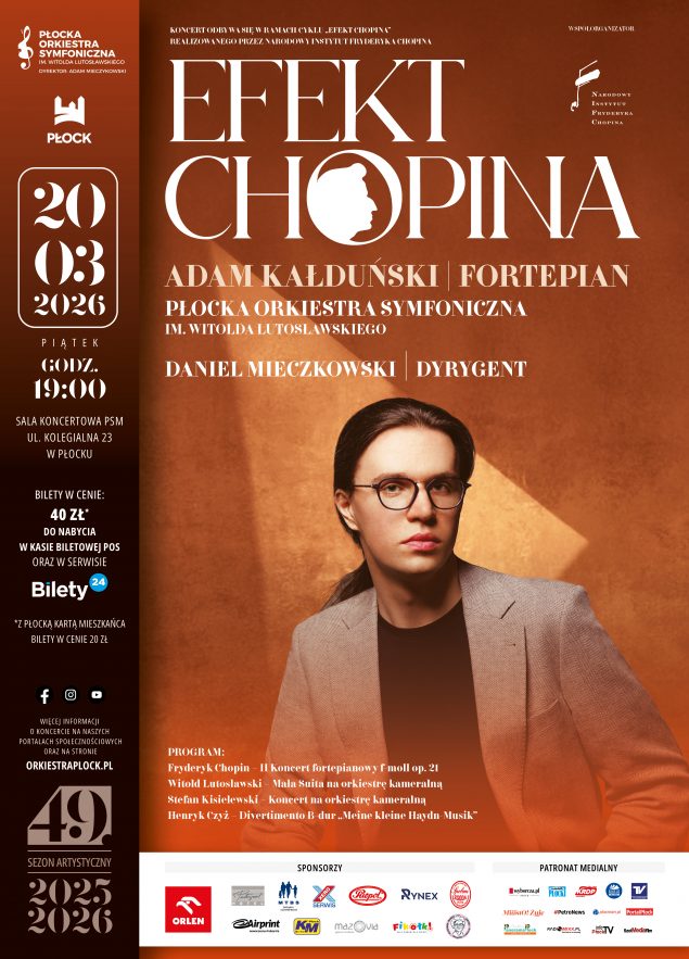Płocką Orkiestrę Symfoniczną od pulpitu dyrygenckiego poprowadzi maestro Daniel Mieczkowski, dyrygent i flecista urodzony w Warszawie. Ukończył studia na Uniwersytecie Muzycznym Fryderyka Chopina w Warszawie w klasie dyrygentury symfoniczno-operowej prof. dr hab. Moniki Wolińskiej i klasie fletu dr hab. Agaty Igras.