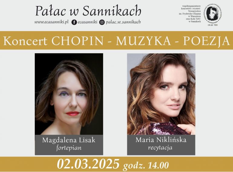 Serdecznie zapraszamy na koncert z cyklu CHOPIN-MUZYKA-POEZJA w niedzielę – 02.03.2025 r., o godzinie 14.00 Podczas wydarzenia wystąpią: