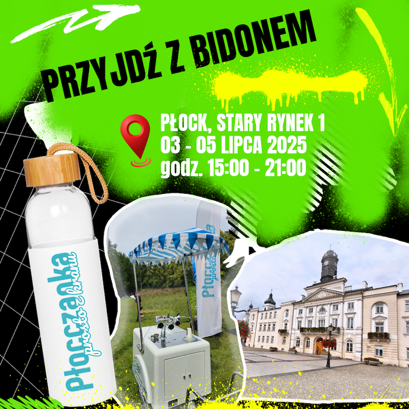 Patrząc na warunki pogodowe, Wodociągi Płockie na starówce w dniach 3-5 lipca będą częstować wodą Płocczanką serwowaną z retro saturatora. Wodę będzie można dostać w godz. 15:00-21:00.