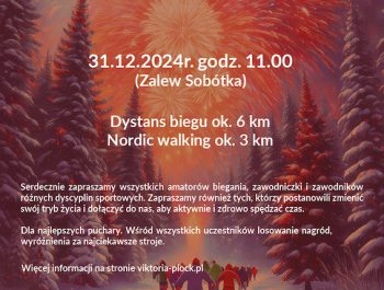 Klub Victoria zaprasza amatorów biegania, zawodniczki i zawodników różnych dyscyplin sportowych na już XIV Płocki Bieg Sylwestrowy. Płocki Bieg Sylwestrowy, jak sama nazwa wskazuje, odbędzie się w sylwestra, 31 grudnia. Początek imprezy o godz....