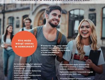 Prezydent Płocka Andrzej Nowakowski zaprasza do udziału w XX edycji konkursu „Dyplom dla Płocka” na najlepsze prace magisterskie, inżynierskie i licencjackie w roku akademickim 2024/2025. Konkurs skierowany jest do studentów wszystkich typów...