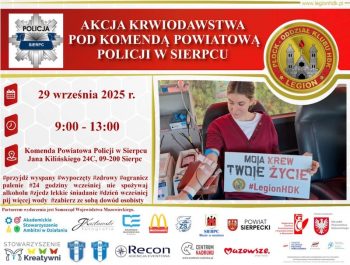 29 września na parkingu wewnętrznym Komendy Powiatowej Policji w Sierpcu odbędzie honorowa zbiórka krwi. Od godz. 09:00 do 13:00 ambulans Regionalnego Centrum Krwiodawstwa i Krwiolecznictwa w Płocku przyjmie krwiodawców. Już w najbliższy poniedziałek,...