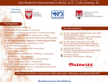 W Płocku odbędzie się konferencja pod hasłem „Być jak Leonardo… Edukacja, która inspiruje”. Wydarzenie organizują Stowarzyszenie Inicjatyw Edukacyjnych DELTA, Mazowieckie Samorządowe Centrum Doskonalenia Nauczycieli Wydział w Płocku oraz...