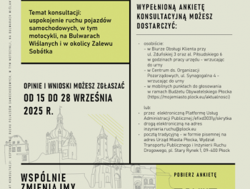 Miasto Płock prowadzi konsultacje społeczne dotyczące wprowadzenia ograniczeń w ruchu pojazdów, w tym także motocykli, na Bulwarach Wiślanych oraz w rejonie zalewu Sobótka. Urząd Miasta Płocka poinformował o prowadzonych konsultacjach społecznych....