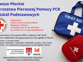 Polski Czerwony Krzyż Oddział Rejonowy w Płocku zaprasza uczniów klas ósmych płockich szkół podstawowych do udziału w Pierwszych Płockich Mistrzostwach Pierwszej Pomocy. Pierwsze Płockie Mistrzostwa Pierwszej Pomocy to pierwsza tego typu inicjatywa...