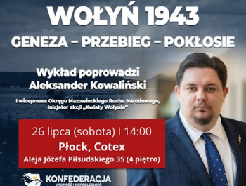 Konfederacja Płock zaprasza na jutrzejszy wykład poświęcony Rzezi Wołyńskiej, który odbędzie się w Płocku. Spotkanie poprowadzi jeden z liderów Konfederacji Aleksander Kowaliński. Wykład pt. „Wołyń 1943 – geneza – przebieg – pokłosie”...