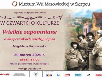 W ramach cyklu „W czwartki o kulturze” Muzeum Wsi Mazowieckiej w Sierpcu zaprasza na wykład „Wielkie zapomniane: o sierpczankach międzywojnia” przygotowany przez regionalistkę Magdalenę Staniszewską. Za sprawą opowieści prelegentki Magdaleny...