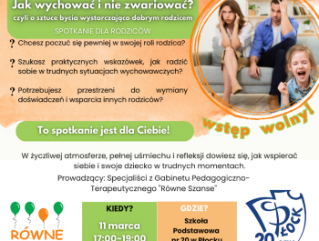 Już 11 marca w Szkole Podstawowej nr 20 w Płocku odbędzie się wyjątkowe spotkanie dla rodziców pt. “Jak wychować i nie zwariować? Czyli o sztuce bycia wystarczająco dobrym rodzicem”. Uczestnicy dowiedzą się, jak budować zdrową relację...