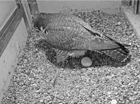 Sokoły wędrowne znoszą od 2 do 4 jaj, więc w najbliższym tygodniu można spodziewać się kolejnych. Marzec będzie kluczowym miesiącem, ponieważ to okres inkubacji pełnego lęgu. W tym czasie samica będzie wysiadywała jaja, a zdobywaniem pożywienia będzie zajmował się samiec. Wszystko wskazuje na to, że młode sokoły powinny wykluć się na początku kwietnia.