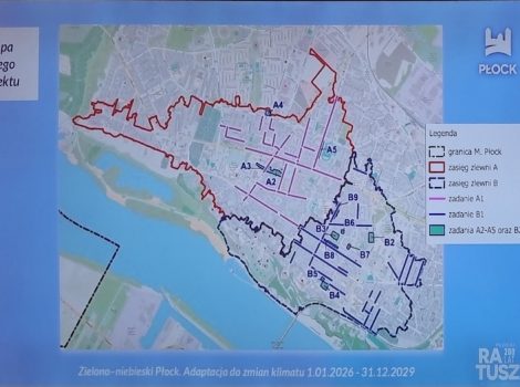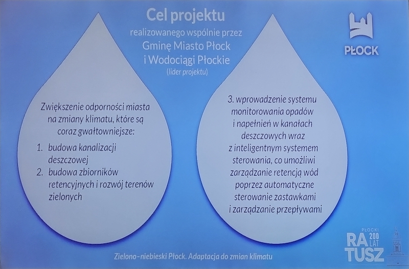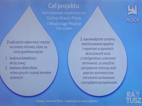 W Urzędzie Miasta Płocka odbyła się konferencja na temat projektu „Zielono–niebieski Płock. Adaptacja do zmian klimatu”. Jego celem jest zwiększenie odporności miasta na zmiany klimatu poprzez budowę kanalizacji deszczowej oraz zbiorników retencyjnych z jednoczesnym rozwojem terenów zielonych oraz wprowadzeniem systemu monitorowania opadów i napełnień w kanałach deszczowych. Całość realizacji inwestycji zakłada 172,2 mln zł.