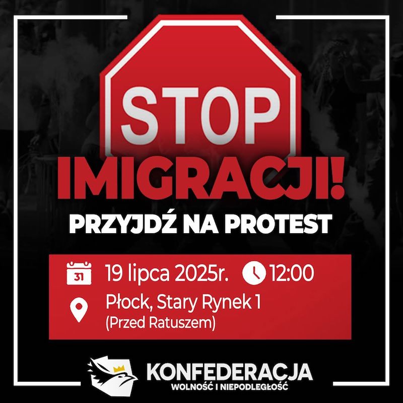 W sobotę, 19 lipca, o godzinie 12:00, na Starym Rynku w Płocku odbędzie się protest przeciwko imigracji zorganizowany przez Konfederację.