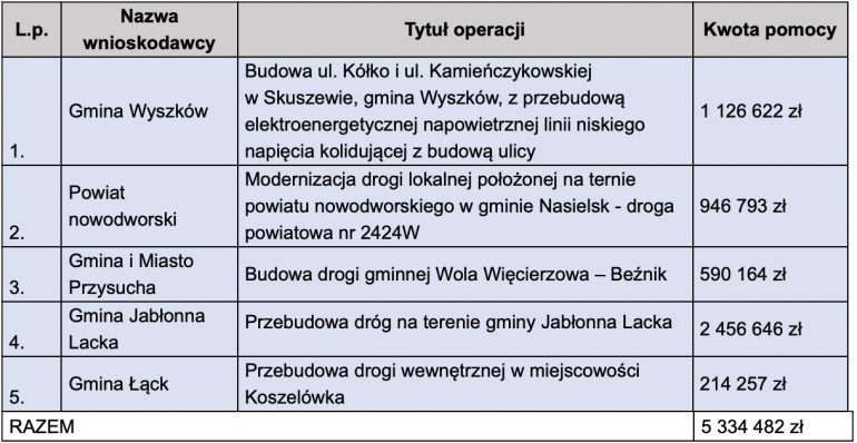 Powstaną nowe drogi w gminach Wyszków i Przysucha, a drogi w powiecie nowodworskim oraz gminach Jabłonna Lacka i Łąck zostaną zmodernizowane. Na ten cel samorząd województwa przeznaczył ponad 5,3 mln zł z Programu Rozwoju Obszarów Wiejskich na lata 2014–2020.