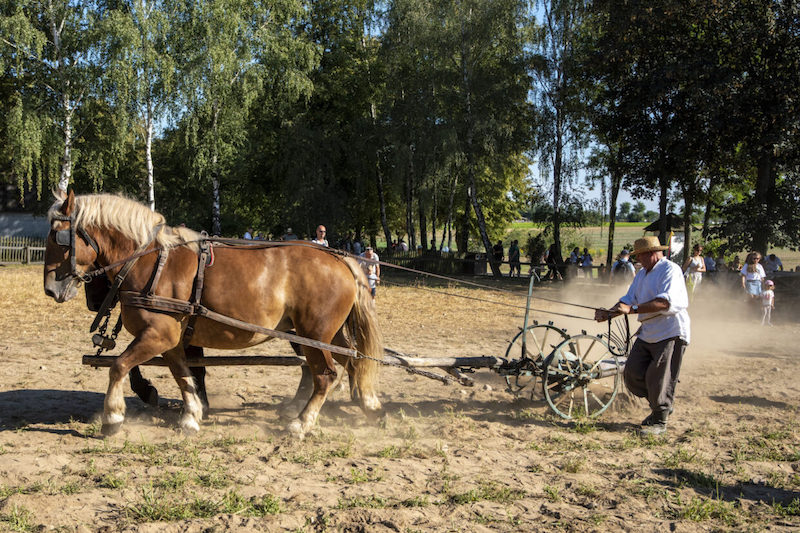 Pole przy zagrodzie z Rzeszotar Zawad – kopanie ziemniaków kopaczką konną (12:00-12:30; 16:00-16:30); kopanie ziemniaków motyczkami, zbieranie i sortowanie (11.30-12.00; 15.30-16.00), orka konna i bronowanie (11:00-11:30; 15:00-15:30)