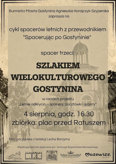 Spacer organizowany jest w ramach cyklu „Spacerując po Gostyninie” oraz projektu „Letnie odkrycia – spacery, pocztówki i szanty” Współorganizatorem jest Samorząd Województwa Mazowieckiego.