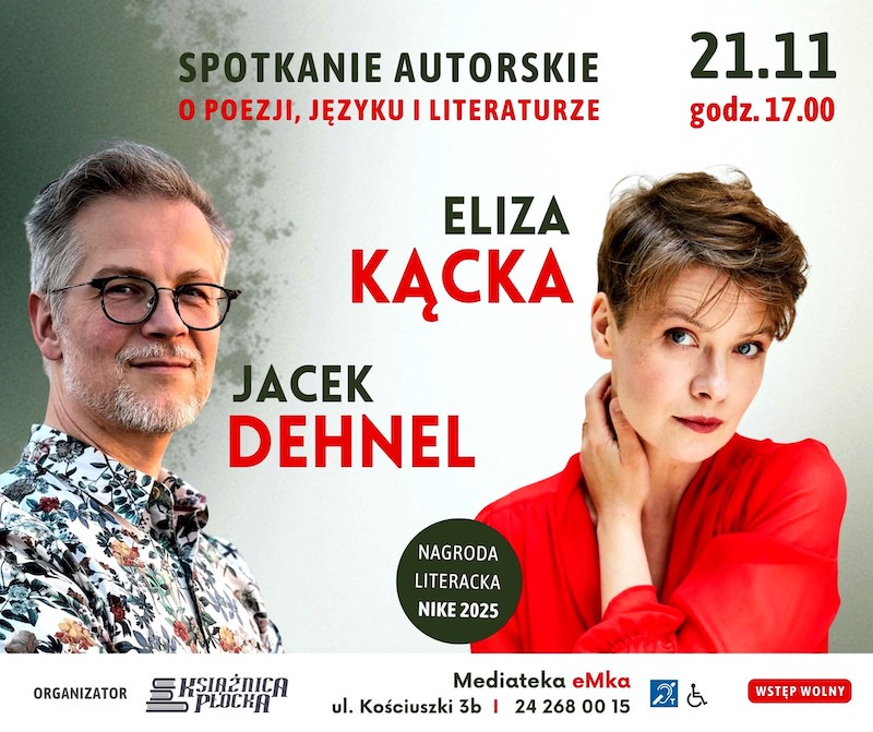 21 listopada o godz. 17:00 w Mediatece eMka Książnicy Płockiej odbędzie się podwójne spotkanie autorskie z Elizą Kącką i Jackiem Dehnelem – jurorami XXXVII Ogólnopolskiego Konkursu Poetyckiego im. Władysława Broniewskiego „O Liść Dębu”.