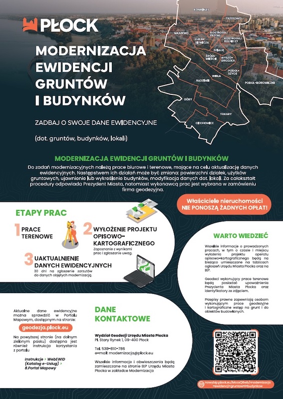 Urząd Miasta Płocka przypomina, że w środę, 26 listopada, o godzinie 12:00 odbędzie się spotkanie informacyjne dotyczące trwającej modernizacji ewidencji gruntów i budynków w obrębie nr 0009 „Wyszogrodzka”.
