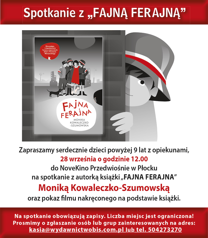 W ramach Festiwalu Książek w Płocku, który odbędzie się w przestrzeni Kina Przedwiośnie przy ul. Tumskiej, zaplanowano spotkanie z Moniką Kowaleczko-Szumowską, autorką książki „Fajna Ferajna”, połączone z projekcją filmu na podstawie tej książki.
