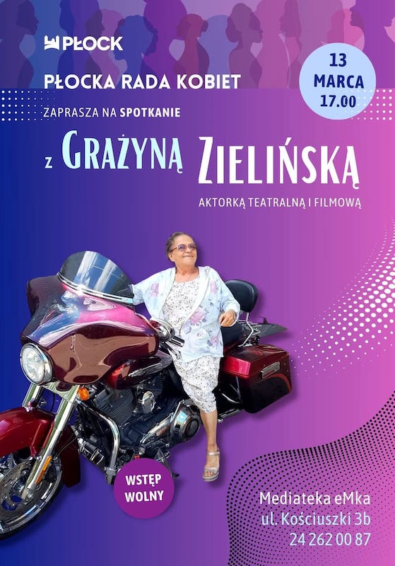 Będzie to spotkanie z niezwykłą kobietą – aktorką Grażyną Zielińską. Artystka od lat związana jest z płocką sceną, występuje w Teatrze Dramatycznym im. Jerzego Szaniawskiego, znana jest także z kreacji filmowych, m.in. serialu „Pierwsza miłość” czy „Na dobre i na złe”. Wstęp na spotkanie jest bezpłatny.