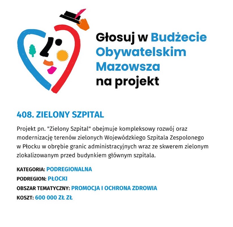 Projekt (408. pn. „ZIELONY SZPITAL”) obejmuje rozwój oraz modernizację terenów zielonych Wojewódzkiego Szpitala Zespolonego w Płocku w obrębie granic administracyjnych wraz ze skwerem zielonym zlokalizowanym przed budynkiem głównym. Placówka planuje wprowadzenie małej architektury: ławki, śmietniki, klomby, zielone nasadzenia.