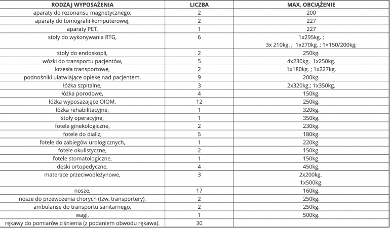 Szpital na potrzeby osób chorych na otyłość III stopnia dysponuje następującym sprzętem: