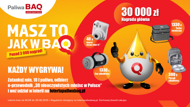 Od 30 kwietnia trwa trzecia edycja loterii Paliwa BAQ organizowana przez ORLEN Paliwa. Akcja potrwa do 25 czerwca i skierowana jest do klientów stacji należących do Programu Paliwa BAQ.