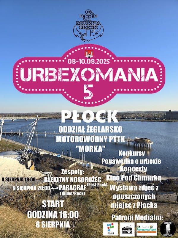 Piąta edycja Urbexomanii odbędzie się w dniach 8–10 sierpnia 2025 roku na terenie Oddziału Żeglarsko-Motorowodnego PTTK „Morka” w Płocku. Wydarzenie na stałe wpisało się już w kalendarz letnich imprez dla fanów urban exploration – czyli eksploracji miejsc opuszczonych, zapomnianych i niedostępnych na co dzień.
